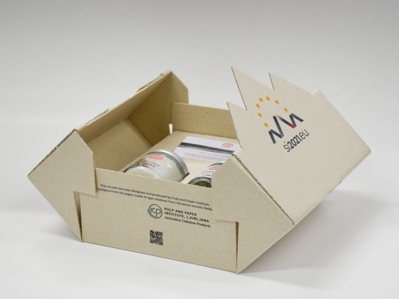 A logical next step to increase the efficiency in the amount of the producer’s waste valorised, in the process economics, and to enable development of new packaging solutions, was the development of  corrugated board. The base paper developed for the bags (a patented process) was further optimized for the production of liners and fluting. The biggest challenge was to find the corrugated board producer with the equipment adjustable for different input materials. A small Slovenian board producer successfully finished the board and the first product – a gift box – was presented for the first time this year.