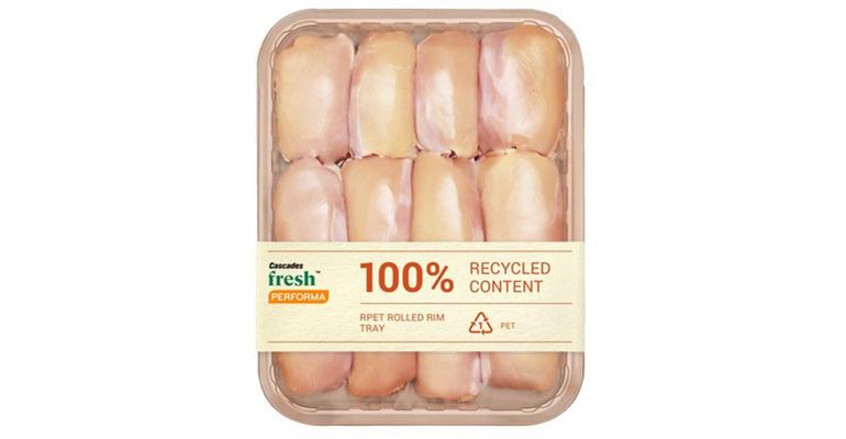 Cascades promotes the product as the first tray with rolled edge technology made of 100% rPET in North America.