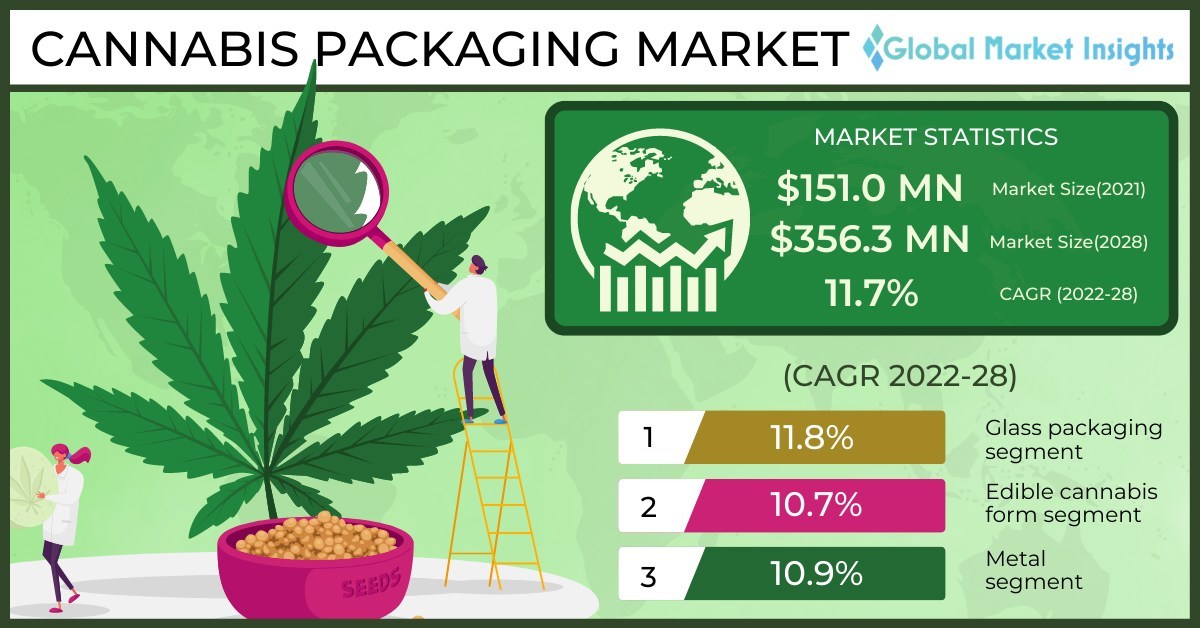 As per the report published by Global Market Insights Inc., the global Cannabis Packaging Market was estimated at USD 151 million in 2021 and is estimated to surpass a valuation of $356.3 million by 2028, progressing at a CAGR of 11.7% from 2022 to 2028. This report offers a detailed analysis of wavering market trends, drivers & opportunities, top winning strategies, competitive scenarios, major investment pockets, and market size & estimations.