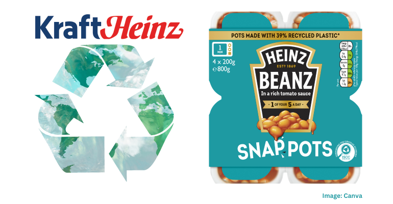 For Heinz baked beans in the UK, the company created recyclable Heinz Beanz Snap Pots. Made from soft plastics, the pots are food-safe and contain 39% recycled plastic collected from consumers at Tesco stores.