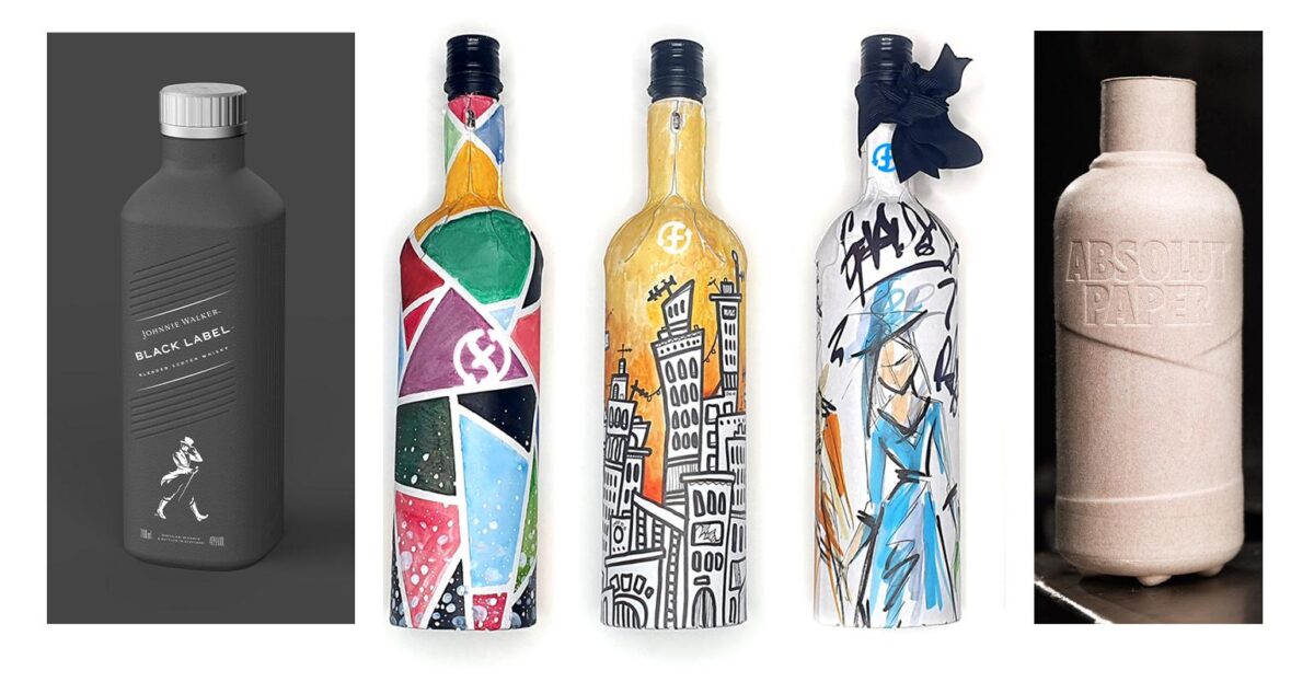 A line-up of paper bottles not to scale from left-to-right: Diageo Johnnie Walker, Frugal Bottles for wines, and Absolut vodka.