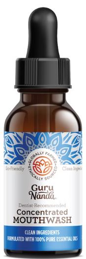 Aromatherapy oil-based mouthwash from GuruNanda comes in a concentrated formula packaged in a 2-oz glass bottle that holds 300 doses and reduces plastic packaging by 99%.